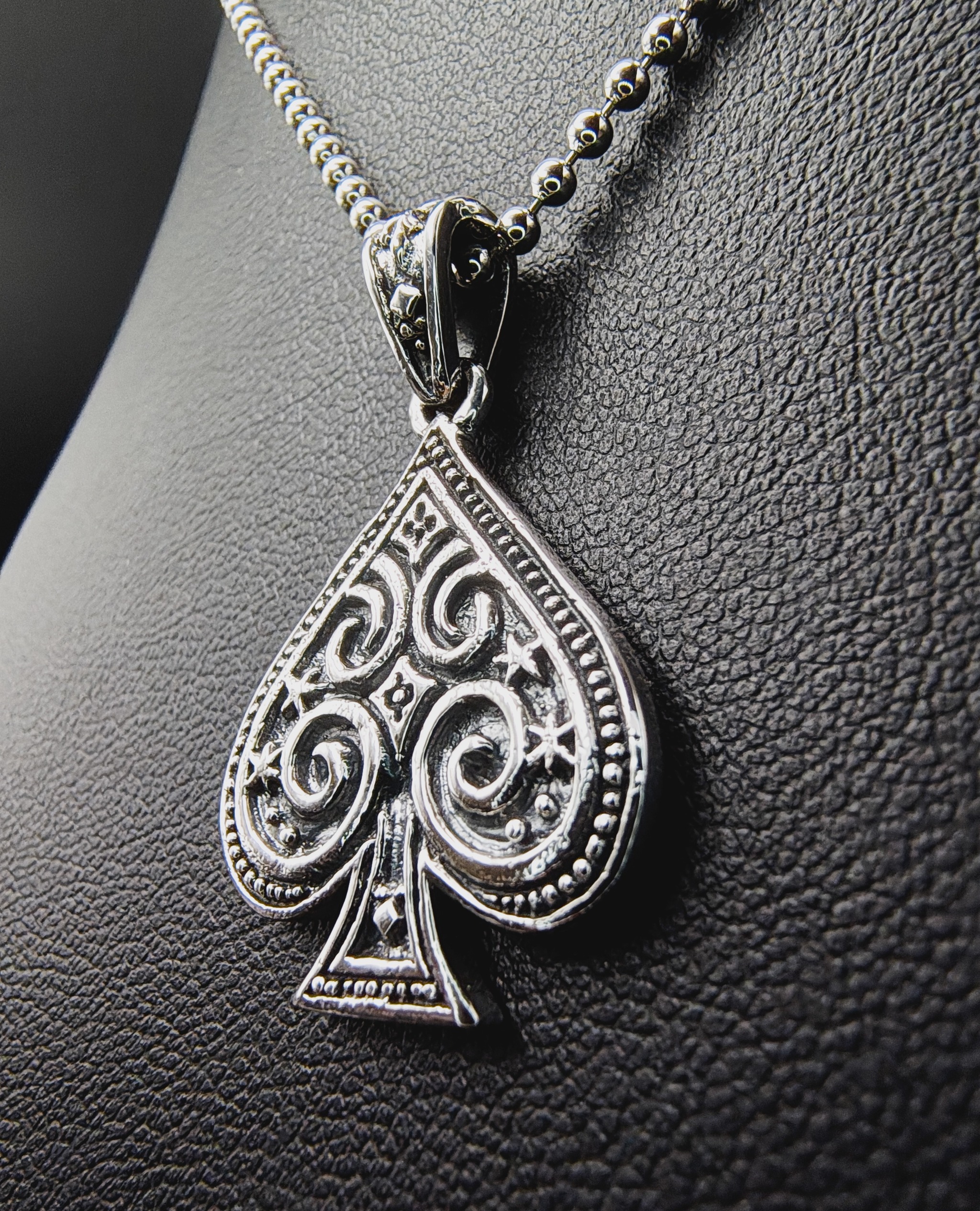 スペードは“剣”や“勝利”に通じるシンボル。螺旋や星の意匠は運命の流れ・拡張を示します。静かな服装に一点投入で、知的な強さが立ち上がる一作。