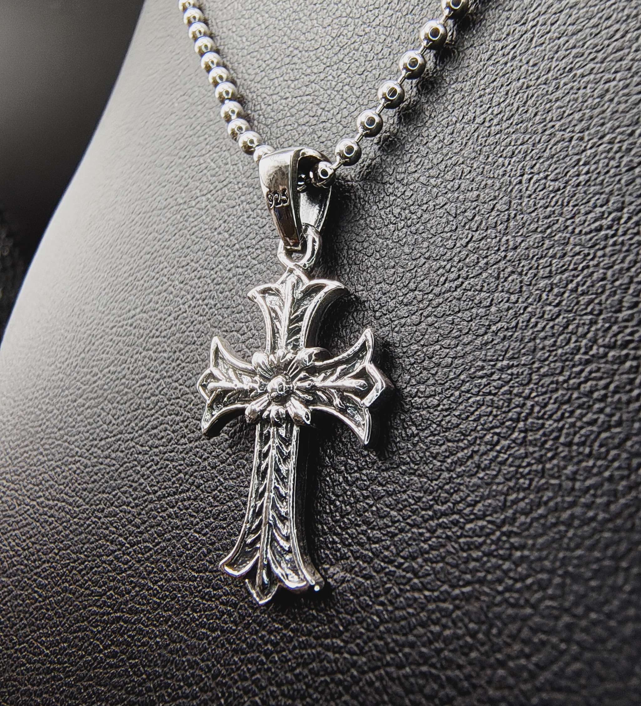 ゴシッククロスの中心に花を配したデザインは、力強さと気品の調和。繊細なフローラルが黒系コーデに映え、モードにもきれいめにも馴染みます。