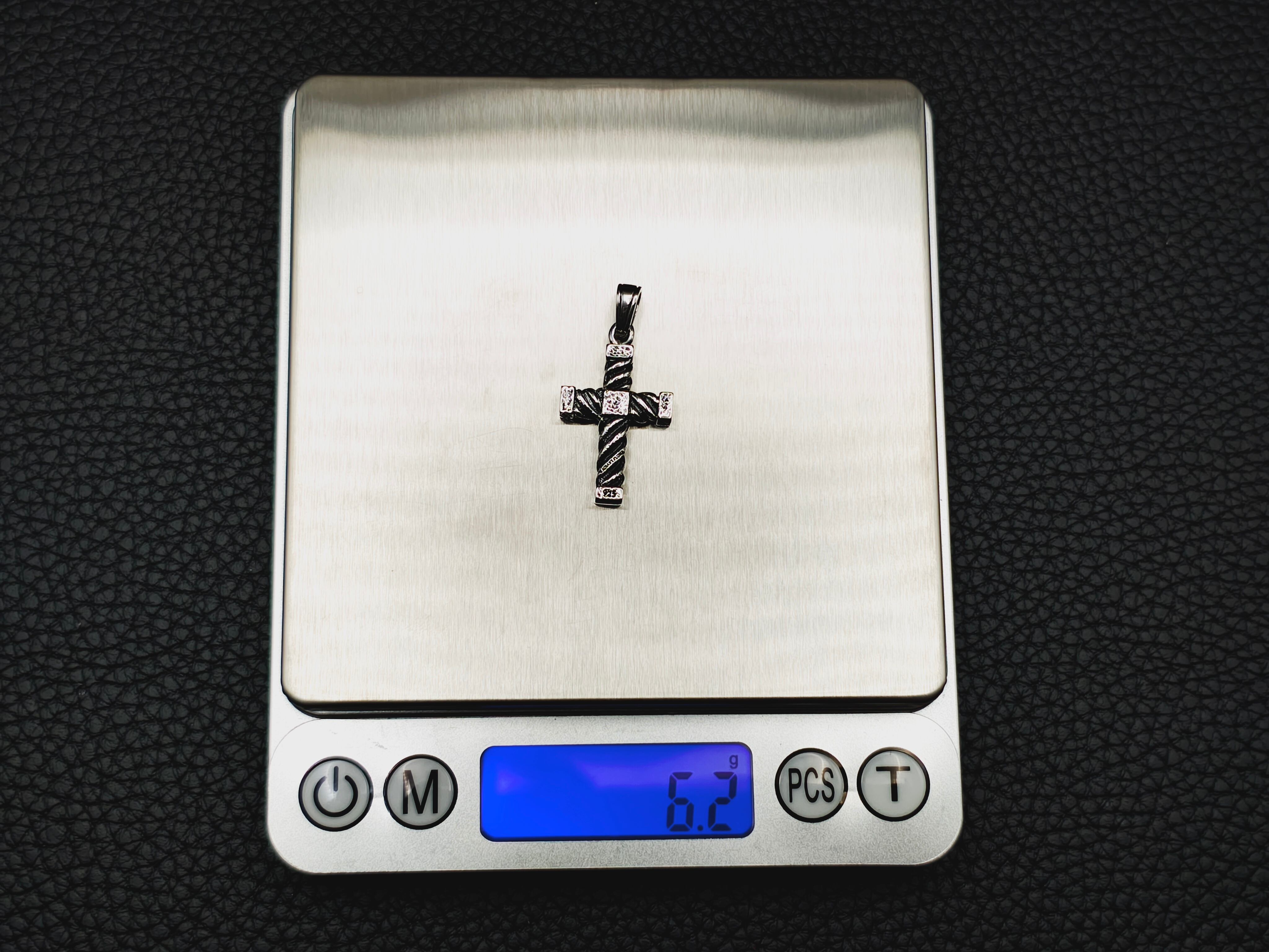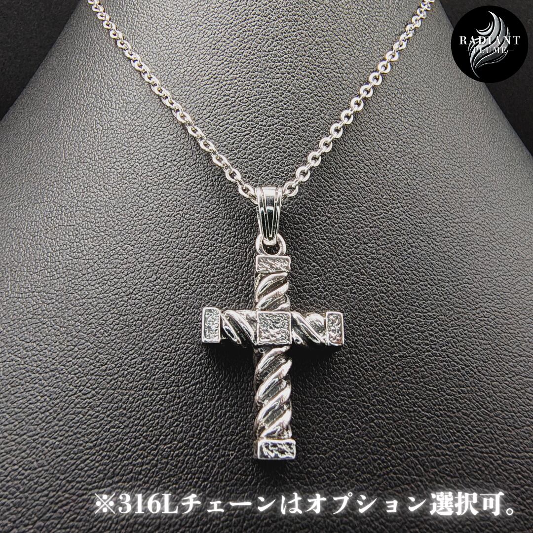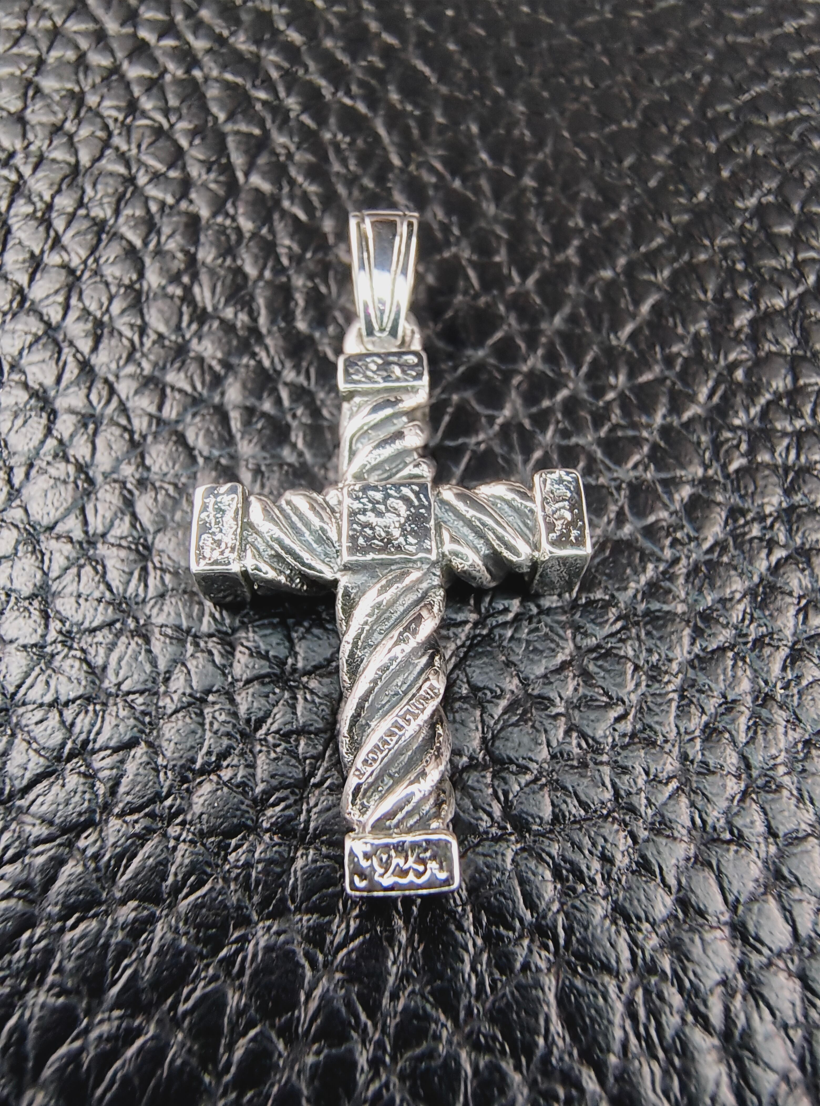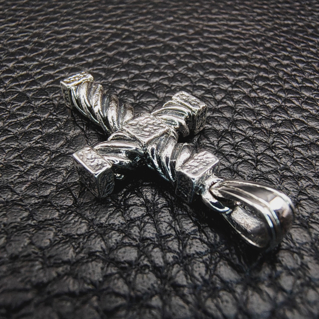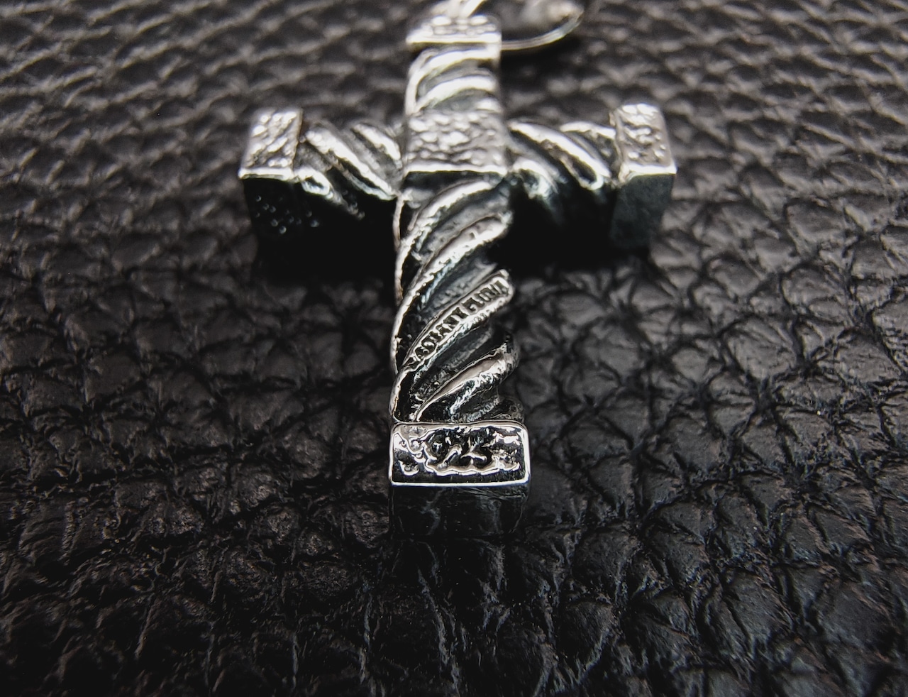 縄目状の軸を交差させ、角ばった装飾を随所に配したクロスペンダント。